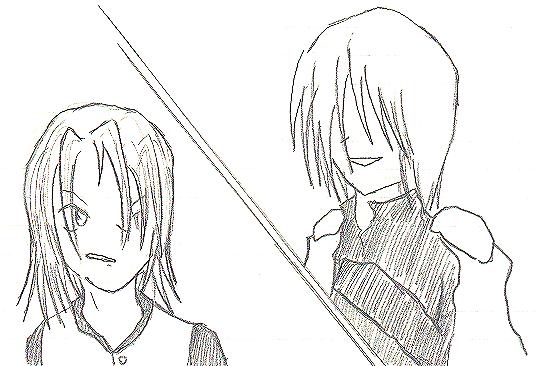 連絡は(来るかどうかわからないけど)弟に。 奴が顔出さなかったらここのコメント欄にでもよろしくお願いします(r(。_ _)。ペコッ このブログで一番したかった事というのは、自分の小説の挿絵計画。 今まではホムペも持っておらず、自分の絵を公開する手段も他人頼りとなってしまっていた為、このような事はできませんでした。 しかぁし!これからはぁ! 自分の小説に思う存分、挿絵が入れられるぞー(`∀´*)ノシ 今回はその第一号、今日更新分の対峙シーンです。 まだ見てない方は急いで攻略の部屋小説掲示板へー♪ *直接飛ぶ*